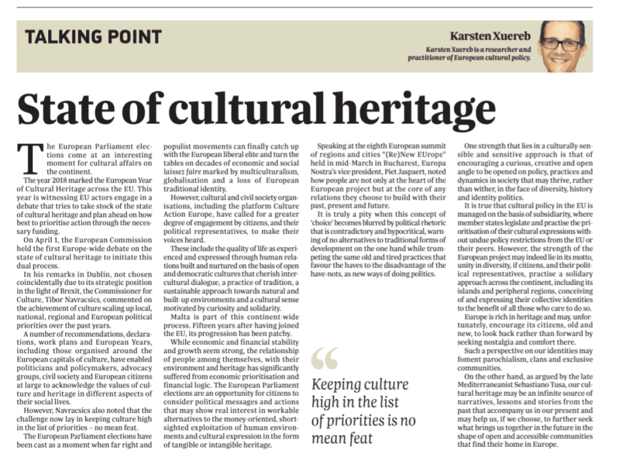 This article addresses the state of culture and heritage in the light of the 2019 European Parliament elections in May.